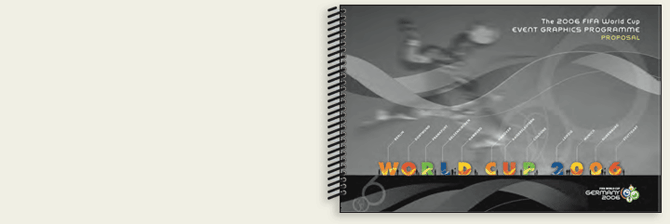 This planning and design proposal was part of a masterplan of identity, environmental graphics, and media platforms for FIFA World Cup Soccer in Germany, 2006. With the infamous event logo and its style guide as a starting point, a catalog of coordinated public information platforms were designed for environmental signage, way-finding, event pageantry, event themeing, event architecture, public information signage systems, event advertising and event-branded media presentations. Part of that effort is shown here. Leaf through these pages to see some of media platforms and communications opportunities to consider when speaking to a world audience at the world's largest sporting event.