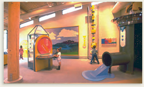The Sookie Goldman Nature Center, located in the Santa Monica Mountains of Los Angeles, is dedicated to introducing inner city school children to the natural environment of the chaparral and high-desert mountains of southern California. The Los Angeles Department of Water & Power sponsored one interactive bay of the nature center to help promote energy and water conservation, an important theme of the nature center. All exhibits were designed so that if you don't read you can still learn. Each exhibit however has a "What To Do" and a "What To Learn" graphics panel as a teachers' guide. Turning cranks, pushing buttons, raising and lowering levers actually make water move through the exhibits, or bubbles burst from nowhere or electrical appliances operate like magic. Hands-on fun becomes a playground of discovery.
